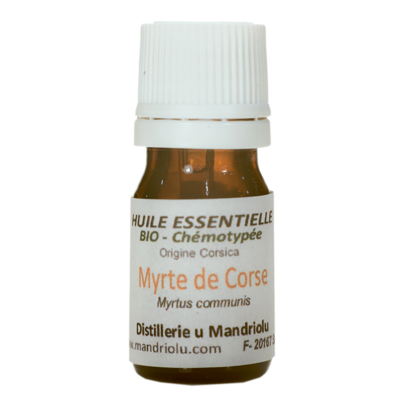 D'odeur fraîche et fleurie, elle est utilisée dans le traitement des voies respiratoires et en cosmétologie. Elle est obtenue par distillation à la vapeur d'eau des feuilles fraîches. L'huile essentielle de myrte de Corse, obtenue à partir de rameaux fleuris, se différencie des autres myrtes par sa couleur jaune verte (d'où son nom de myrte verte). Plus douce que l'Eucalyptus elle est particulièrement bien tolérée par les asthmatiques, les enfants et les personnes âgées.
